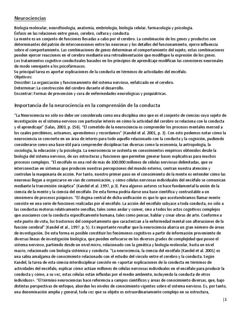 y el aprendizaje” (Salas, 2003, p. 156). “El cometido de la neurociencia es comprender los procesos mentales merced a