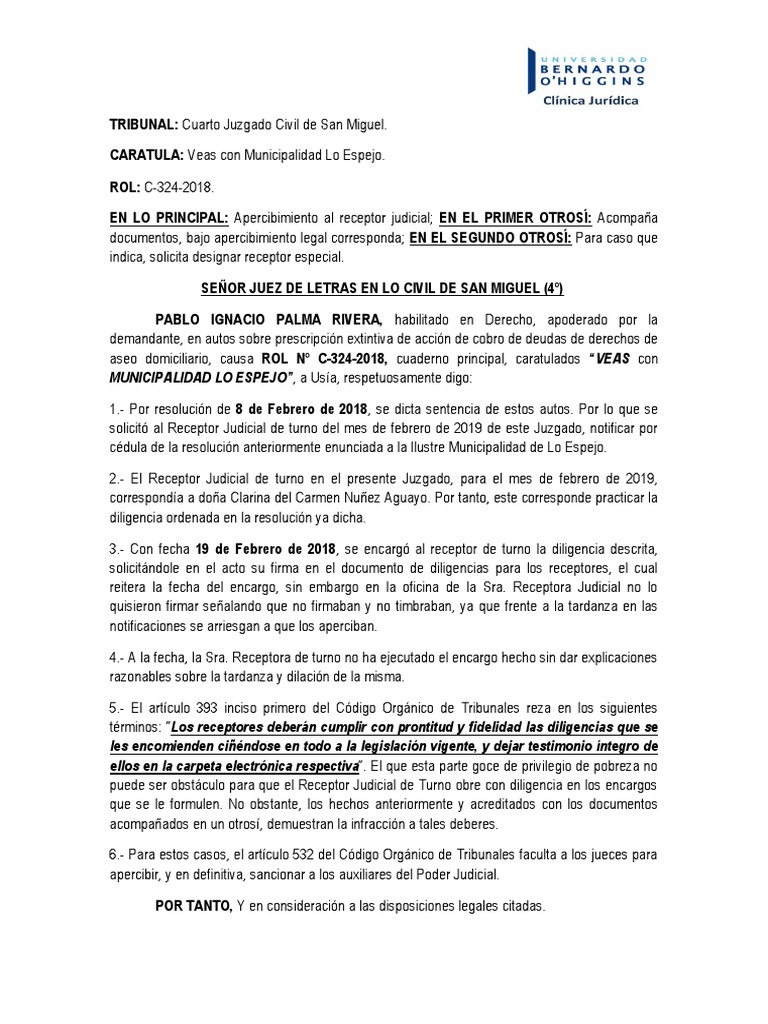 EN LO PRINCIPAL: Apercibimiento al receptor judicial; EN EL PRIMER OTROSÍ: Acompaña