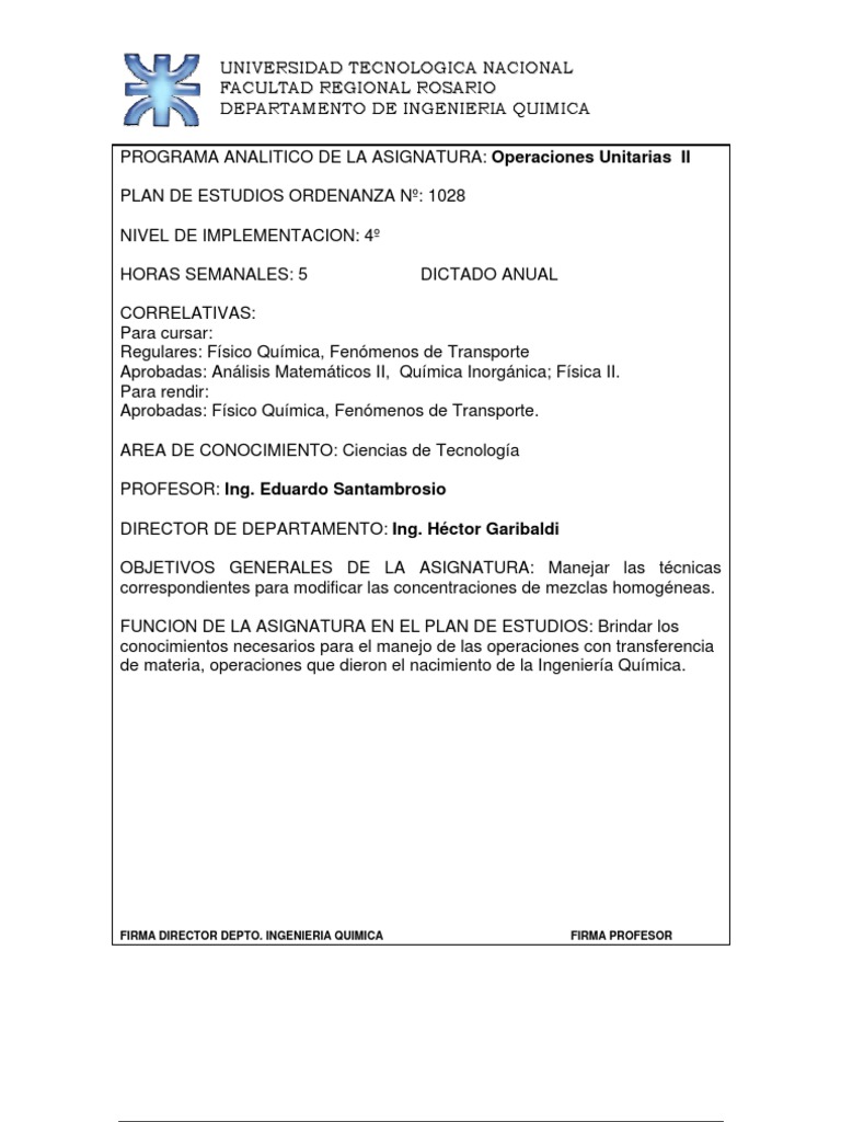 PROGRAMA ANALITICO DE LA ASIGNATURA: Operaciones Unitarias II
