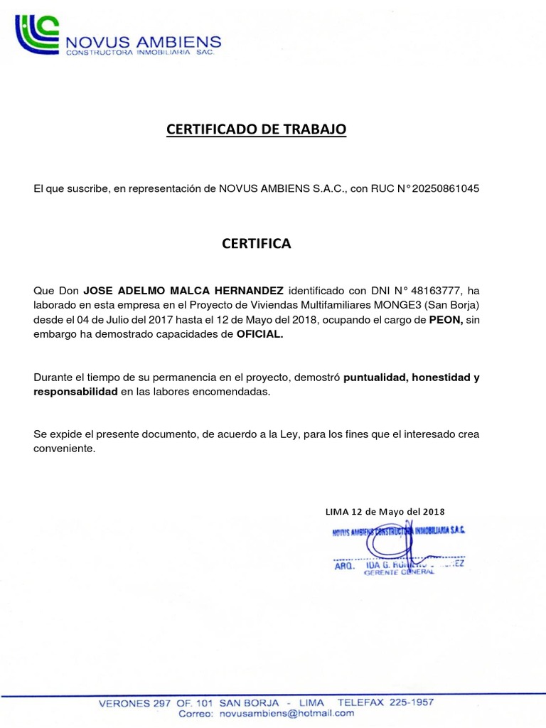 CERTIFICADO DE TRABAJO