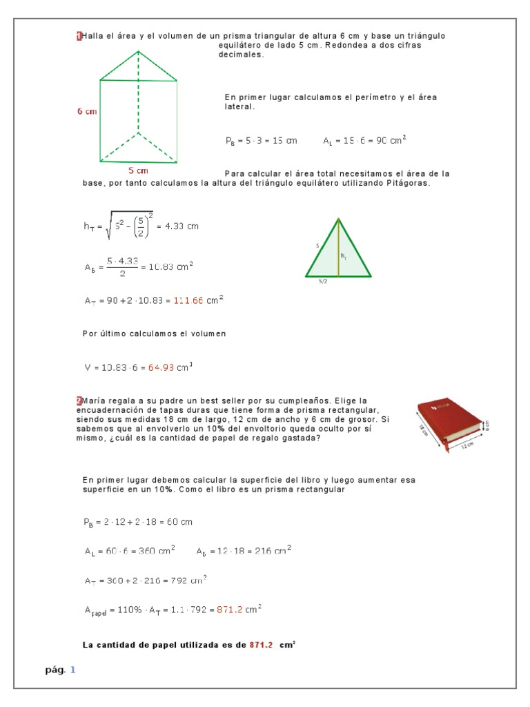 1Halla el área y el volumen de un prisma triangular de altura 6 cm y base un triángulo