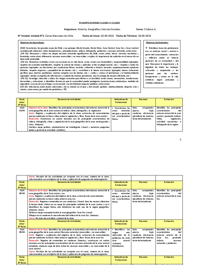 N° Unidad: Unidad N°1: Zonas Naturales de Chile. Fecha de Inicio: 02-04-2018 Fecha de Término: 30-04-2018