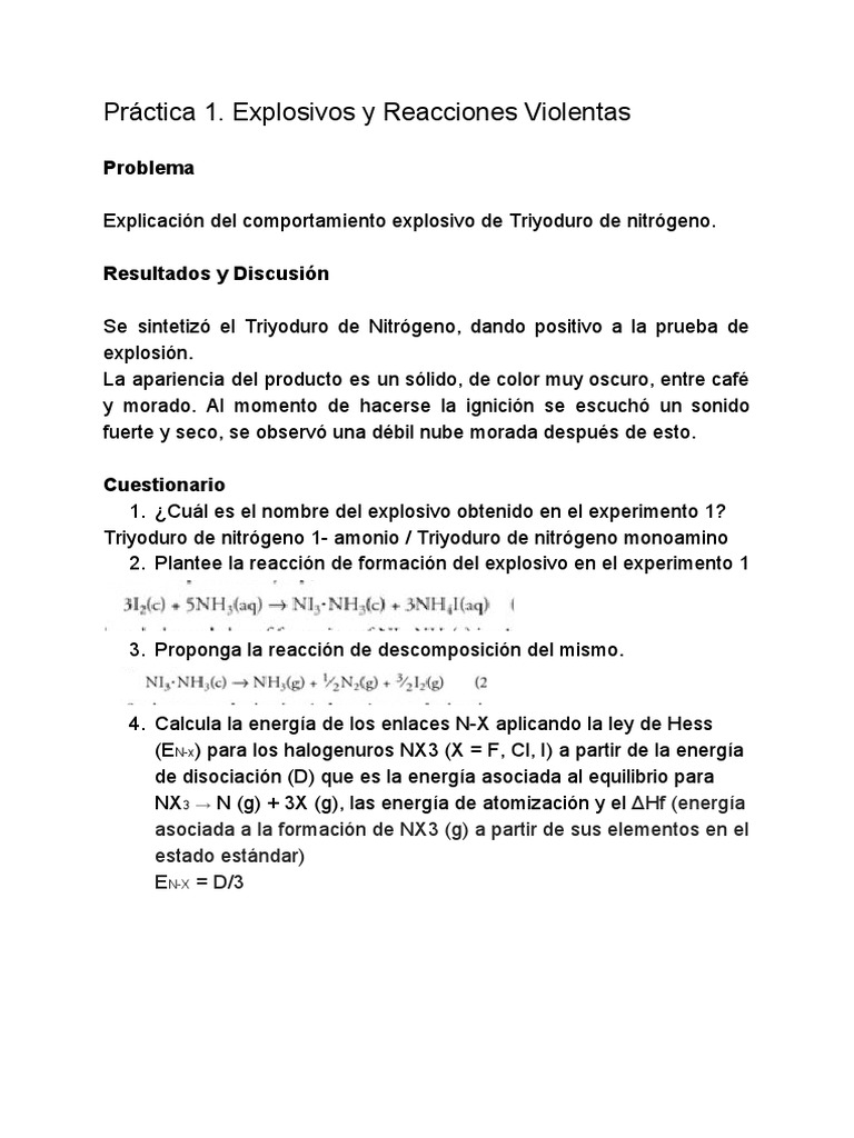 2. Plantee la reacción de formación del explosivo en el experimento 1