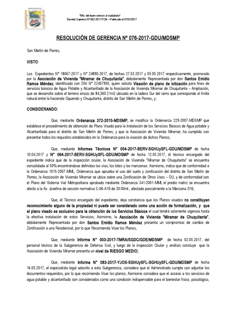 RESOLUCIÓN DE GERENCIA Nº 076-2017-GDU/MDSMP