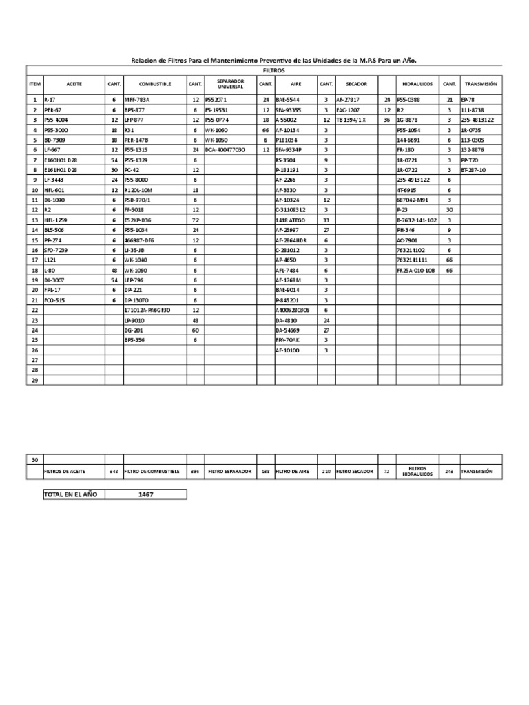 Relacion de Filtros Para el Mantenimiento Preventivo de las Unidades de la M.P.S Para un Año.