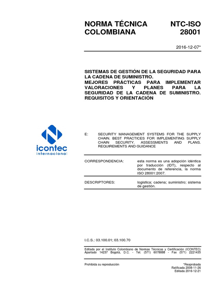 La norma NTC-ISO 28001 fue ratificada por el Consejo Directivo de 2008-11-26 y reaprobada