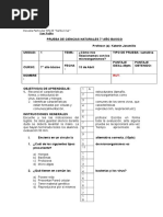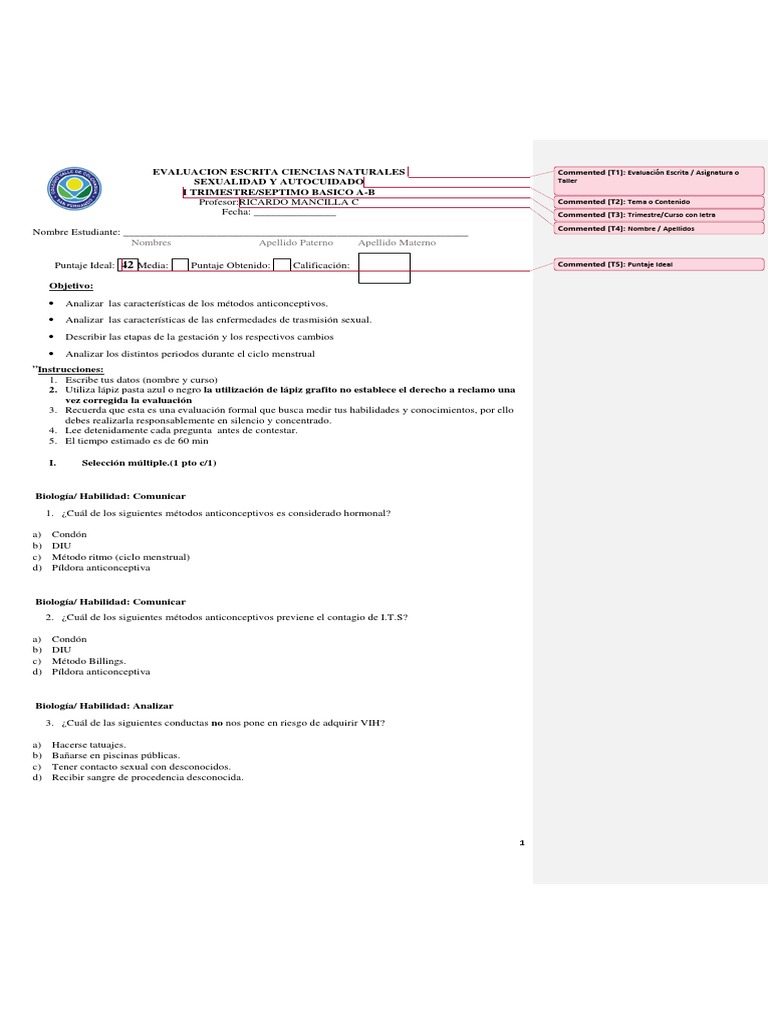 EVALUACION ESCRITA CIENCIAS NATURALES Commented [T1]: Evaluación Escrita / Asignatura o