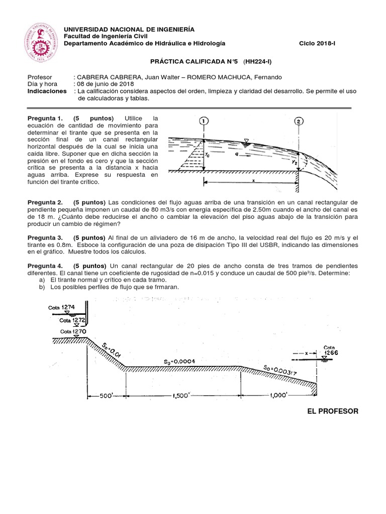 Pregunta 2. (5 puntos) Las condiciones del flujo aguas arriba de una transición en un canal rectangular de