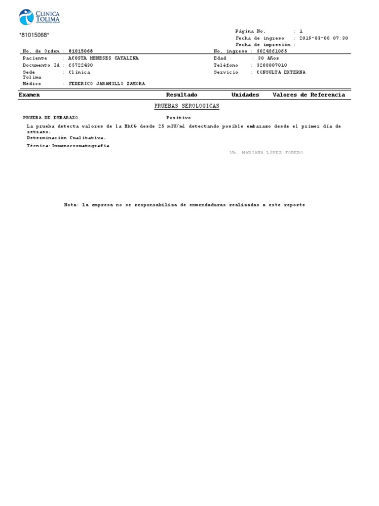 Paciente : ACOSTA MENESES CATALINA Edad : 30 Años