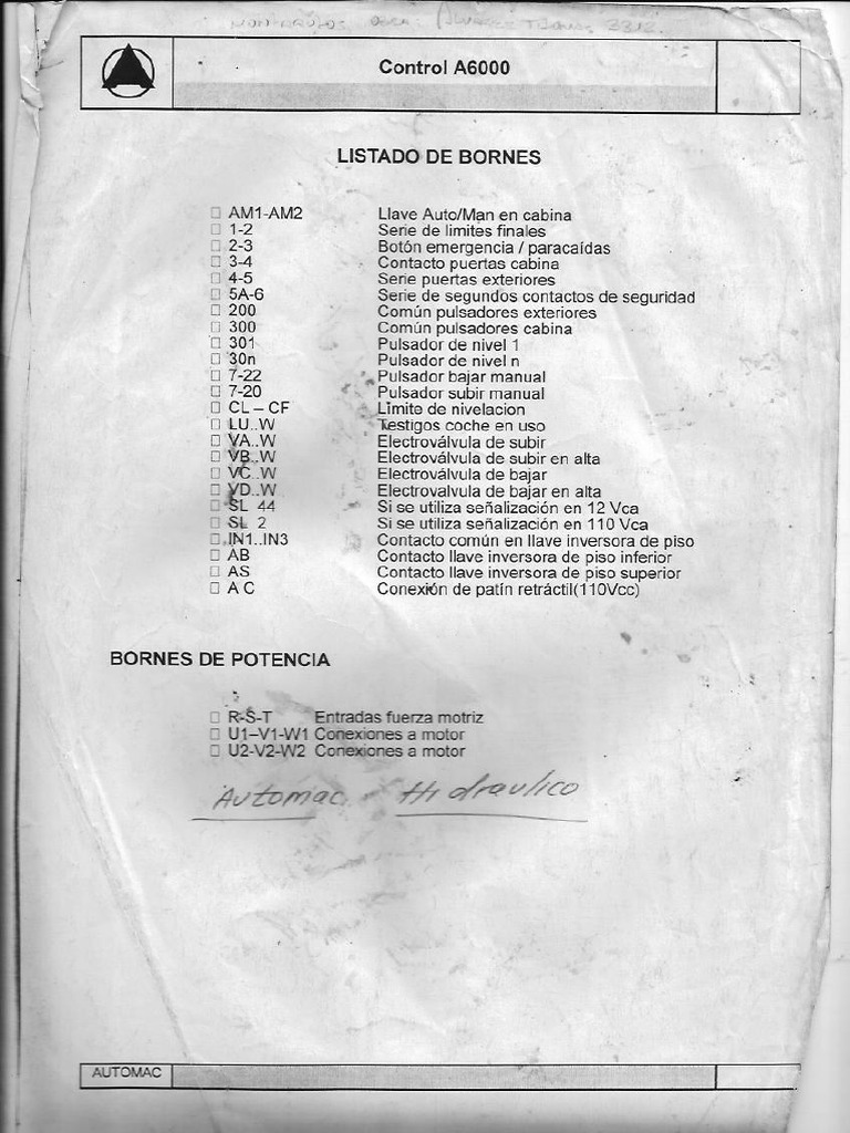 Automac A6000 Oleodinámico Electromecánico - Listado de Bornes