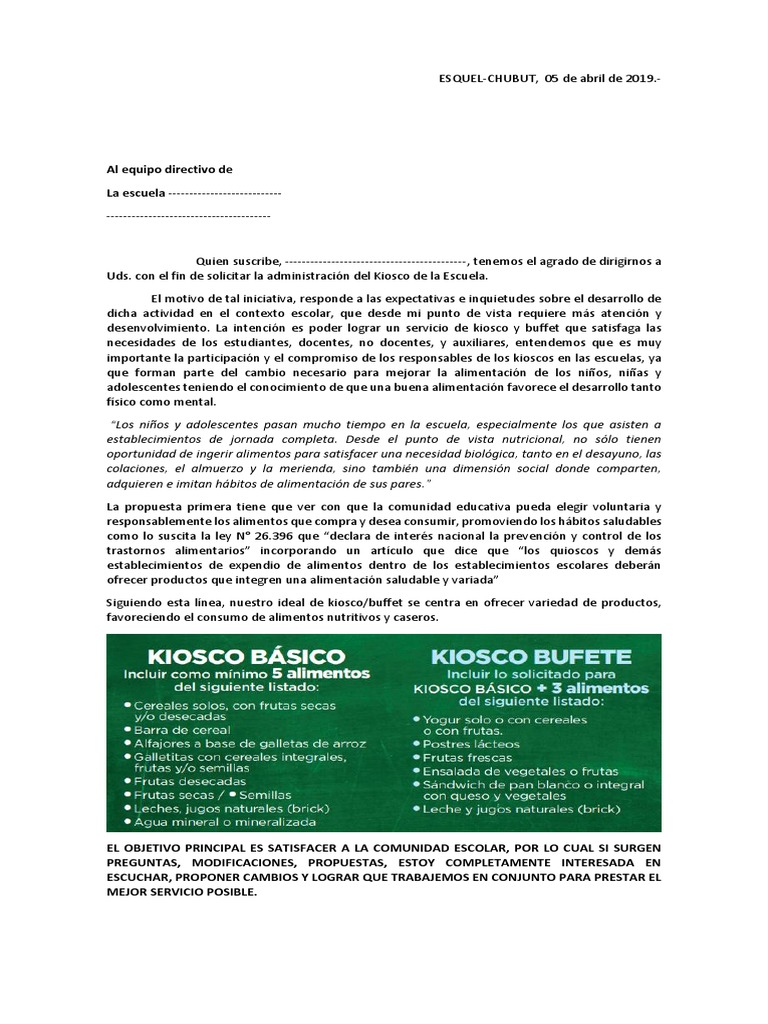 Uds. con el fin de solicitar la administración del Kiosco de la Escuela.