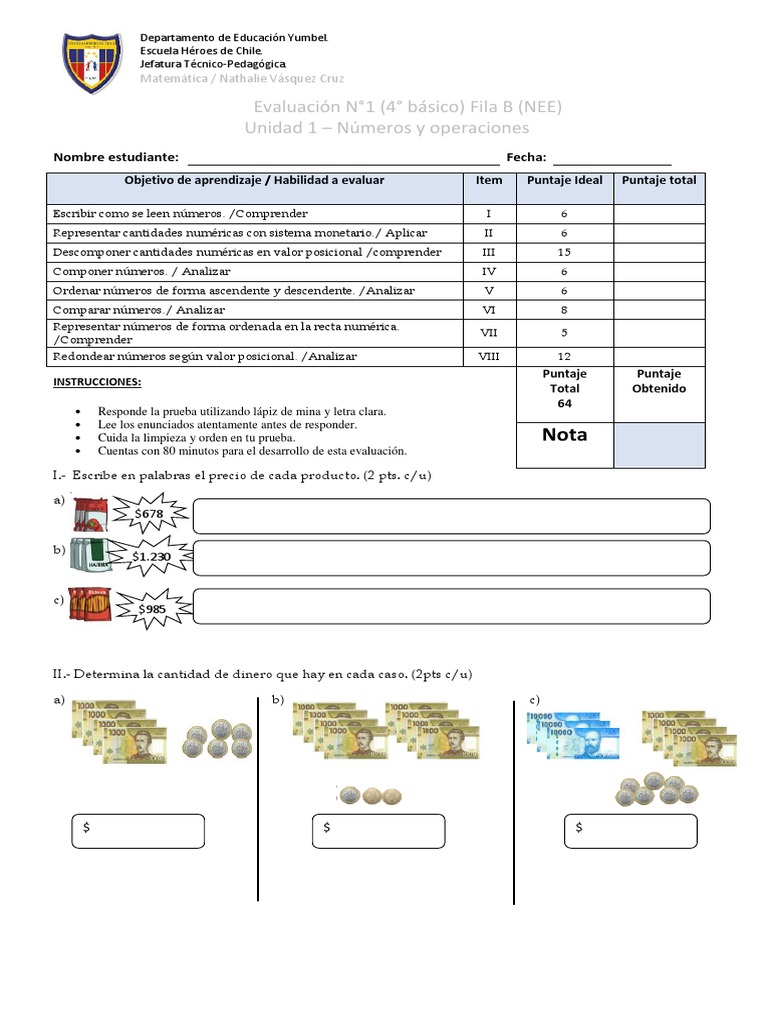 Evaluación N°1 (4° básico) Fila B (NEE)
