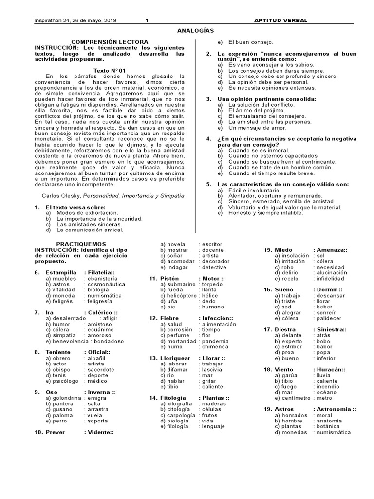 Inspirathon 24, 26 de mayo, 2019 1 APTITUD VERBAL