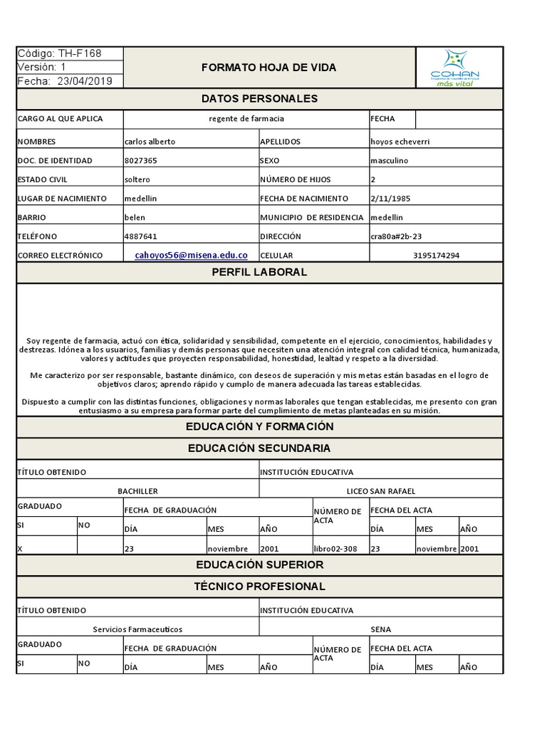 Versión: 1 FORMATO HOJA DE VIDA
