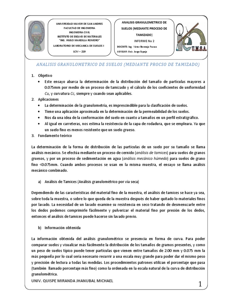 UNIVERSIDAD MAYOR DE SAN ANDRES ANALISIS GRANULOMETRICO DE