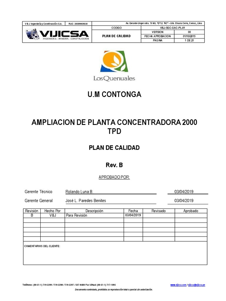 El presente Plan de Calidad define cómo V & J INGENIERÍA Y CONSTRUCCIÓN S. A. establecerá el proceso y la