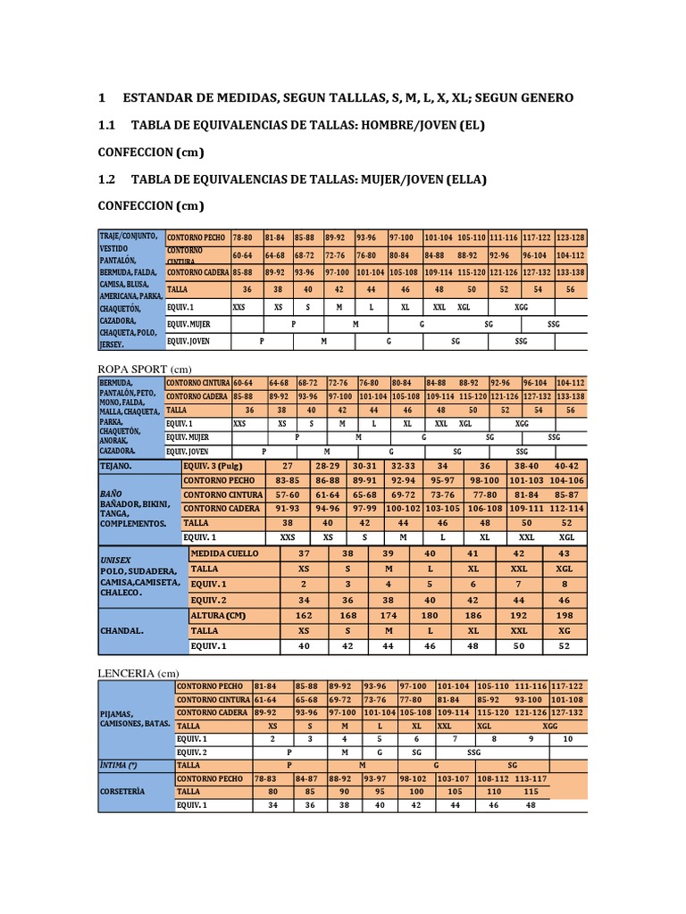 1 ESTANDAR DE MEDIDAS, SEGUN TALLLAS, S, M, L, X, XL; SEGUN GENERO