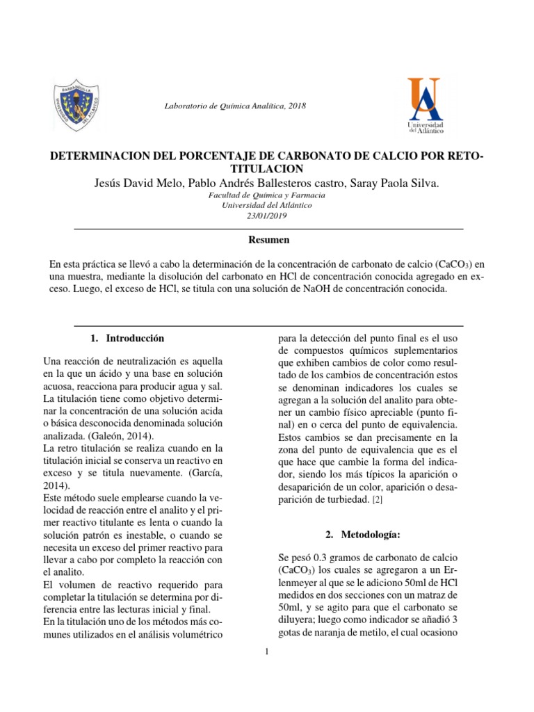 En esta práctica se llevó a cabo la determinación de la concentración de carbonato de calcio (CaCO3) en