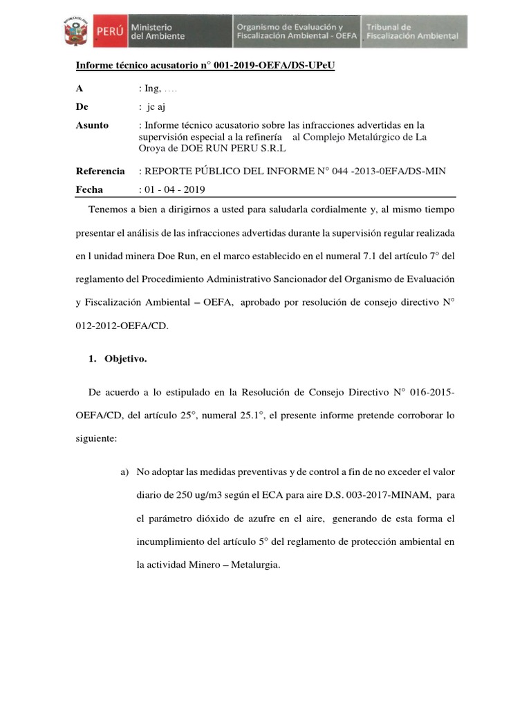 OEFA/CD, del artículo 25°, numeral 25.1°, el presente informe pretende corroborar lo