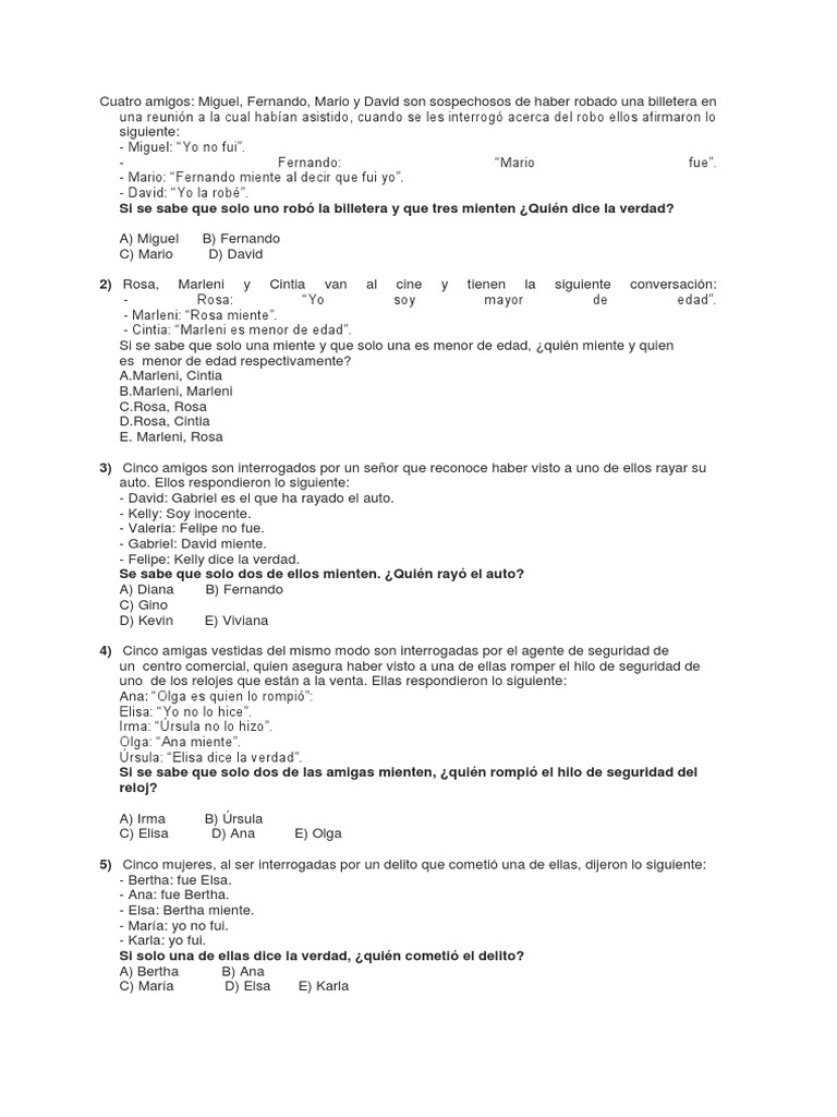 5) Cinco mujeres, al ser interrogadas por un delito que cometió una de ellas, dijeron lo siguiente: