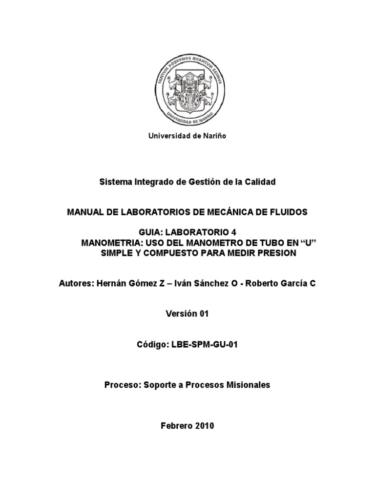 MANOMETRIA: USO DEL MANOMETRO DE TUBO EN “U” Vigente a Partir de 16/02/2010
