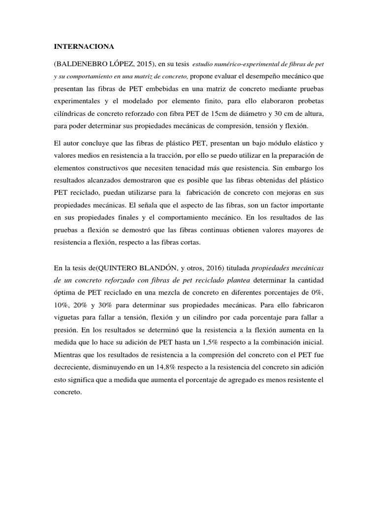 (BALDENEBRO LÓPEZ, 2015), en su tesis estudio numérico-experimental de fibras de pet
