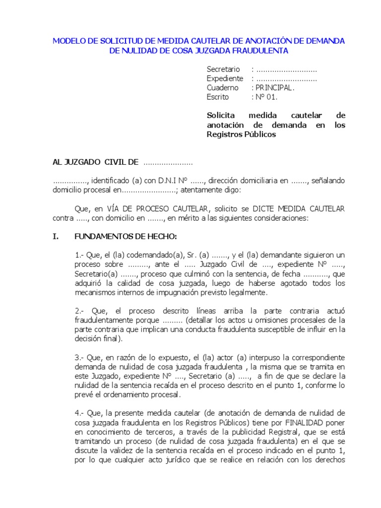 MODELO DE SOLICITUD DE MEDIDA CAUTELAR DE ANOTACIÓN DE DEMANDA