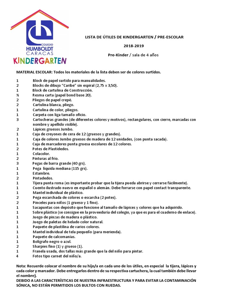 LISTA DE ÚTILES DE KINDERGARTEN / PRE-ESCOLAR