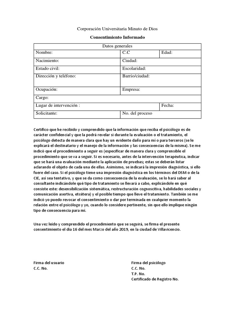 consentimiento el día 16 del mes Marzo del año 2019, en la ciudad de Villavicencio.