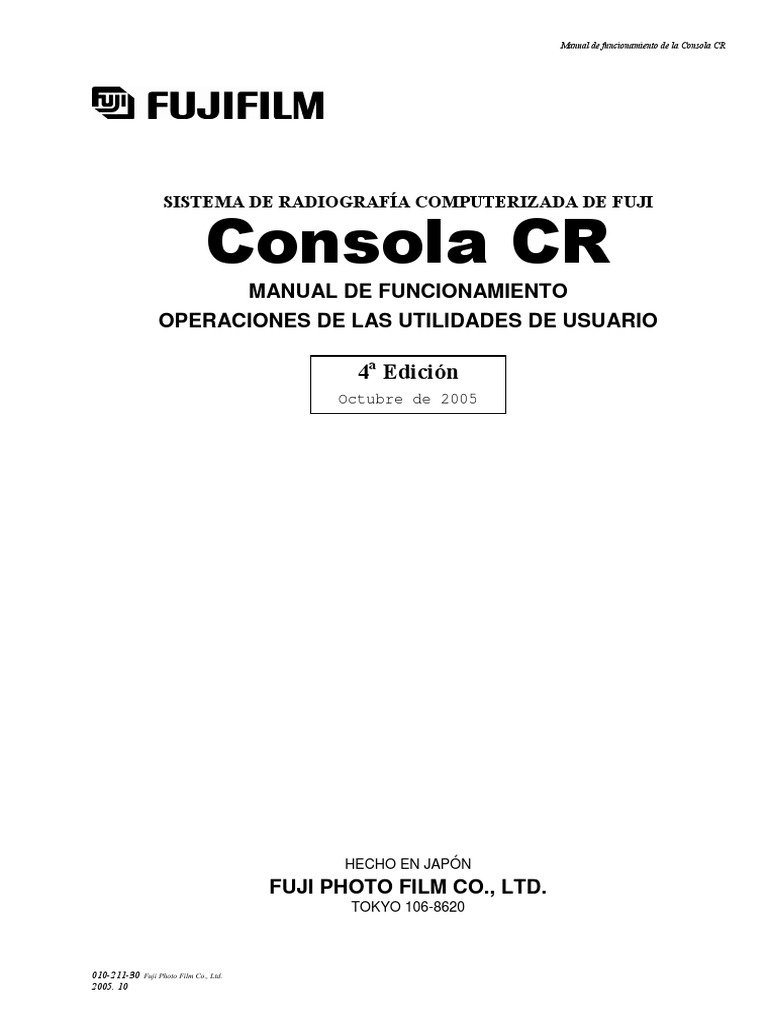 Este documento proporciona un manual de funcionamiento para la consola CR de radiografía computarizada de Fuji. Explica las diferentes utilidades de usuario disponibles para la configuración de la consola, incluyendo la configuración de menús, tablas y propiedades, así como la actualización de parámetros, copia de seguridad, transferencia de archivos y registro de resultados. También describe cómo iniciar y finalizar la configuración de usuario y cómo crear, editar y borrar menús de exposición.