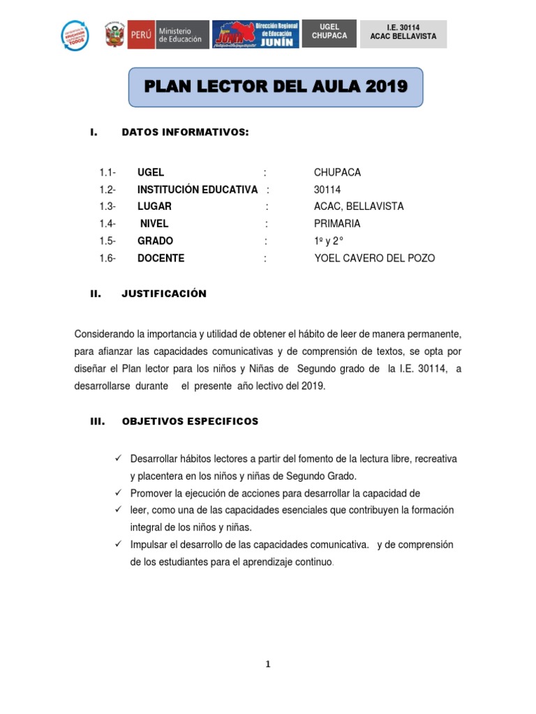 diseñar el Plan lector para los niños y Niñas de Segundo grado de la I.E. 30114, a