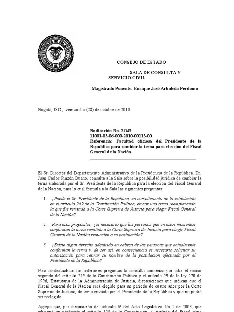 Juan Carlos Pinzón Bueno, consulta a la Sala sobre la posibilidad jurídica de cambiar la