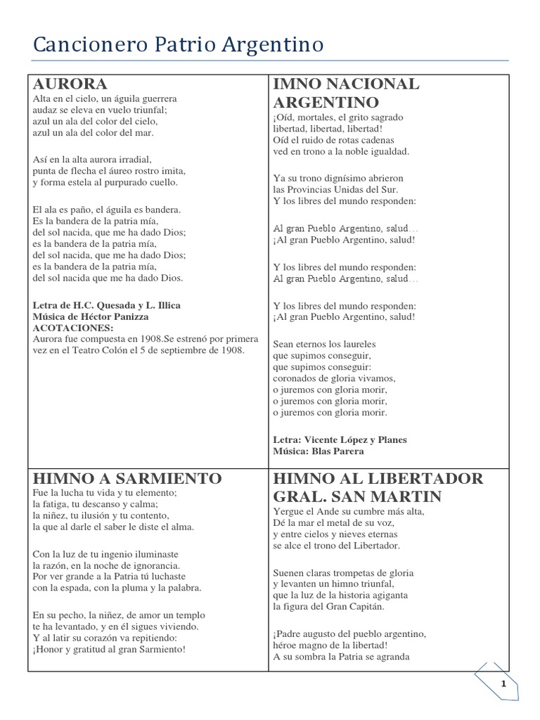 del sol nacida, que me ha dado Dios; Al gran Pueblo Argentino, salud…