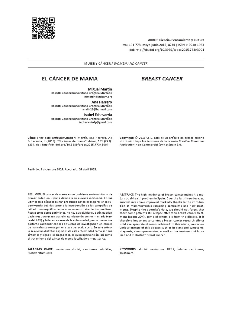 Echavarría, I. (2015). “El cáncer de mama”. Arbor, 191 (773): distribuido bajo los términos de la licencia Creative Commons