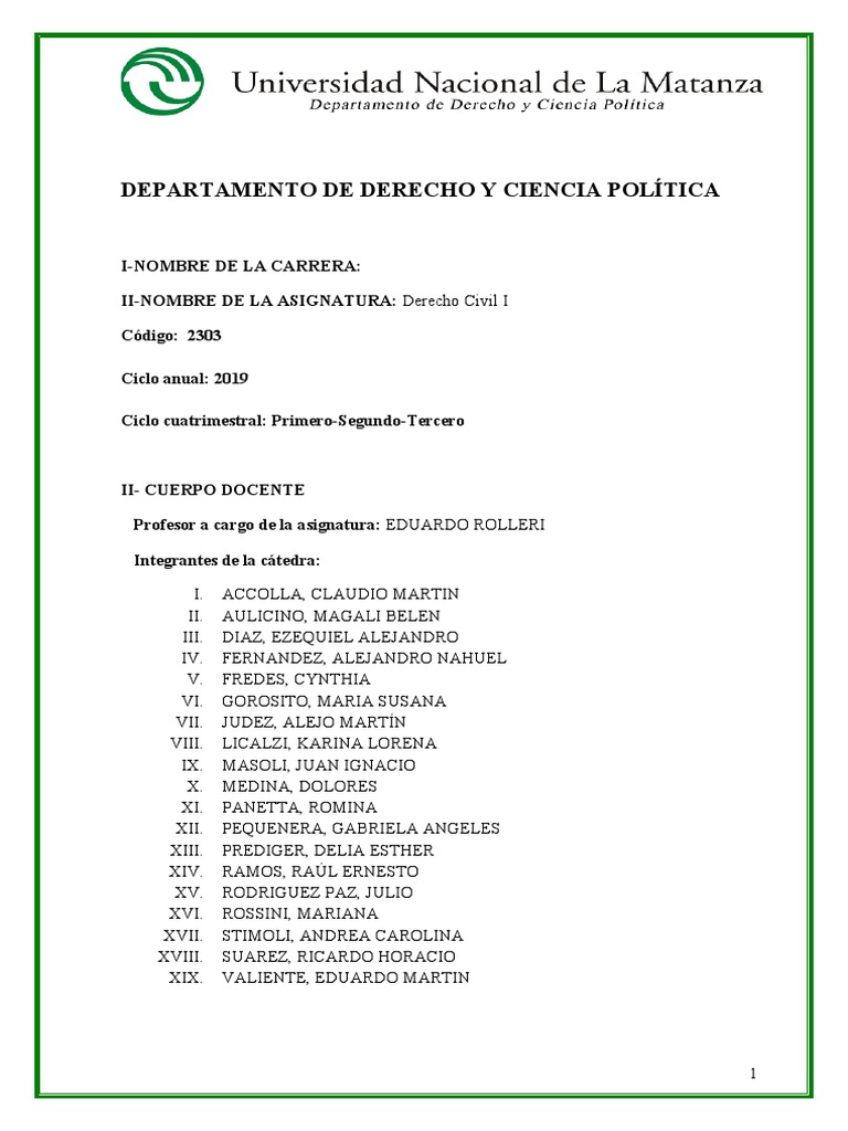II-NOMBRE DE LA ASIGNATURA: Derecho Civil I