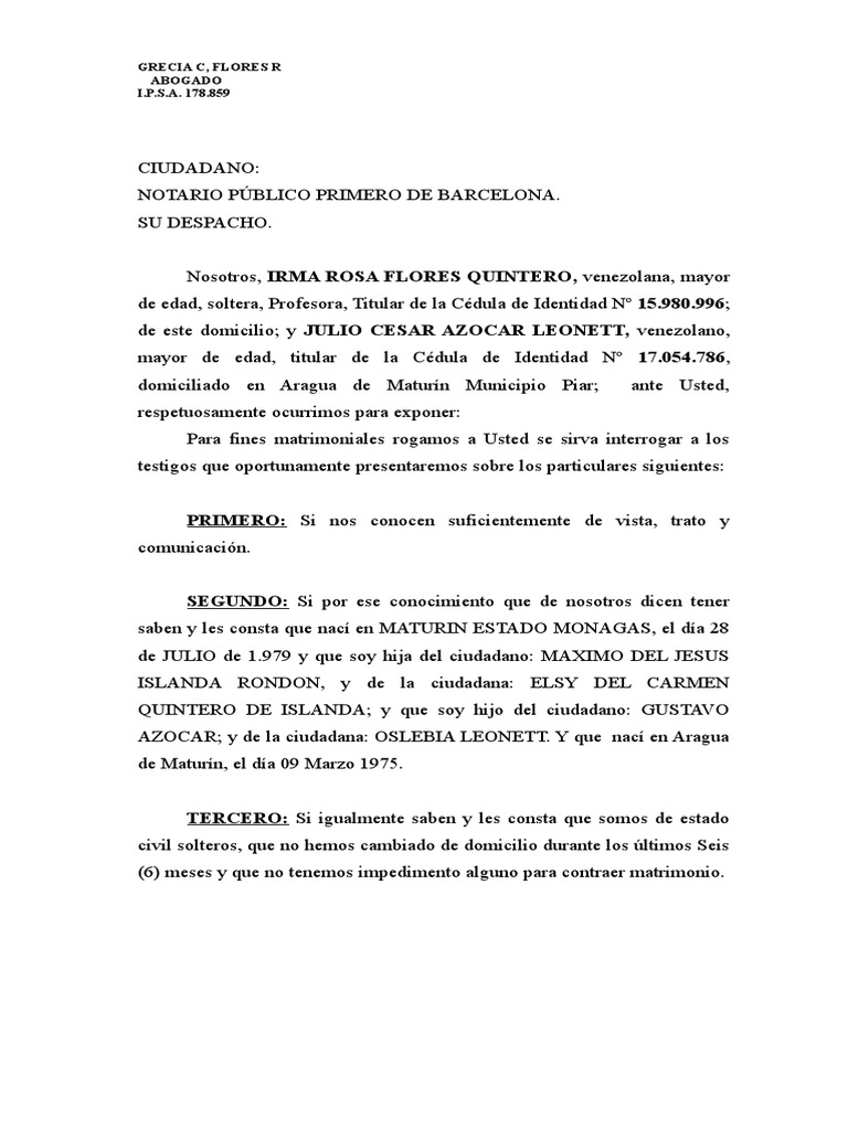 Para fines matrimoniales ruego a Usted se sirva interrogar a los