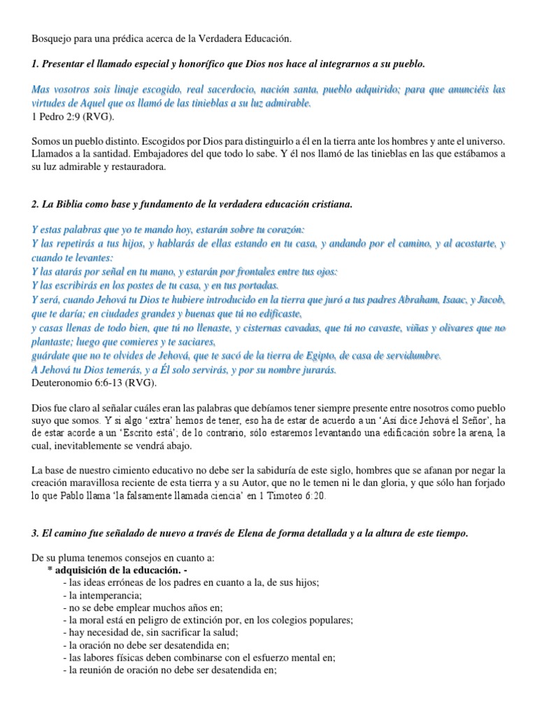 Bosquejo para una prédica acerca de la Verdadera Educación.