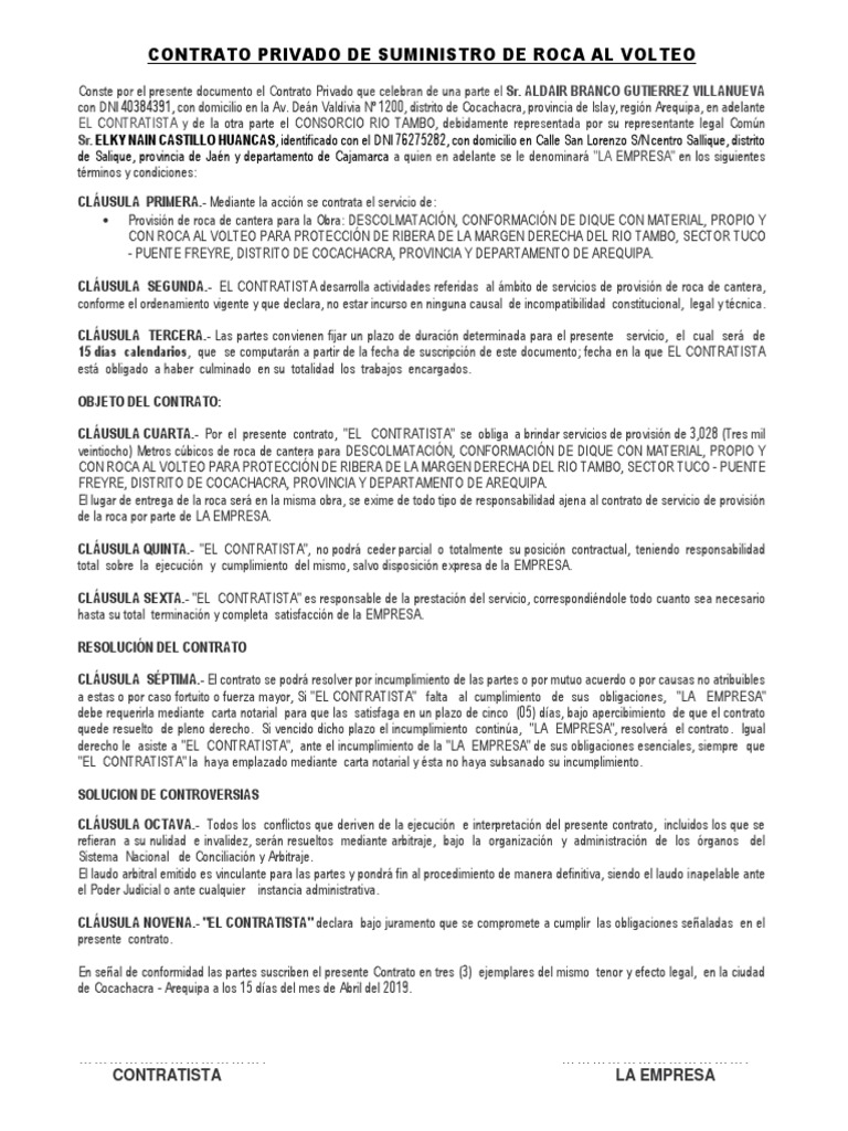 CONTRATO PRIVADO DE SUMINISTRO DE ROCA AL VOLTEO