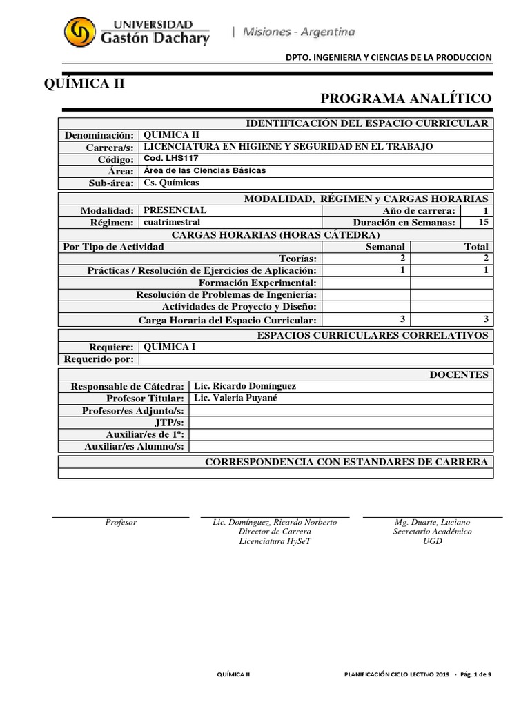 QUÍMICA II PLANIFICACIÓN CICLO LECTIVO 2019 - Pág. 1 de 9