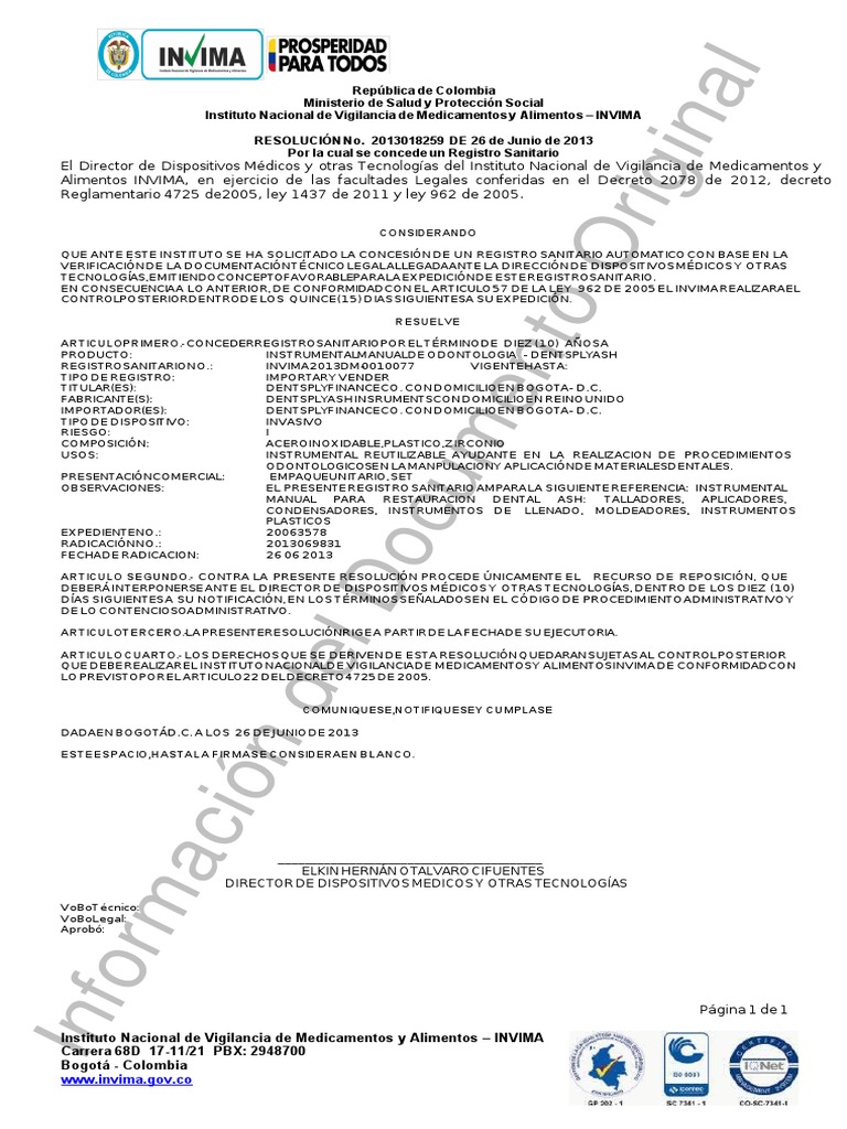 REGISTRO SANITARIO NO.: INVIMA 2013DM-0 010077 V IGENTE HASTA: