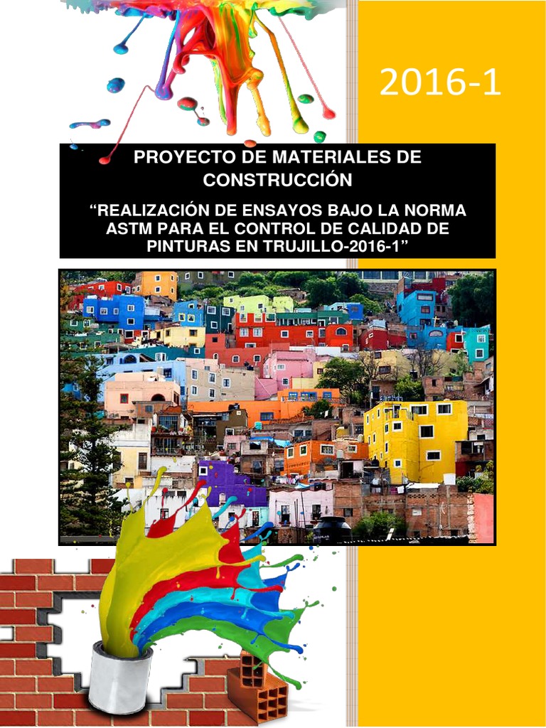 Este documento presenta un proyecto de investigación sobre la realización de ensayos bajo la norma ASTM para el control de calidad de pinturas en Trujillo-2016. El proyecto es desarrollado por 5 estudiantes de ingeniería civil de la Facultad de Ingeniería de la Universidad de Trujillo bajo la supervisión de un profesor. El documento incluye información técnica sobre una pintura látex premium llamada Supermate, incluyendo sus características, método de aplicación, rendimiento y preparación de superficies.