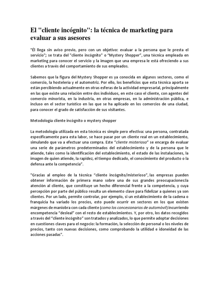 servicio"; se trata del "cliente incógnito" o “Mystery Shopper”, una técnica empleada en