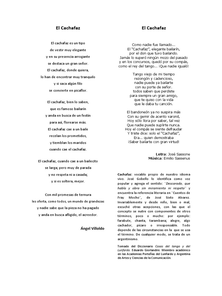 y no respeta ni a casada; Cachafaz: vocablo propio de nuestro idioma