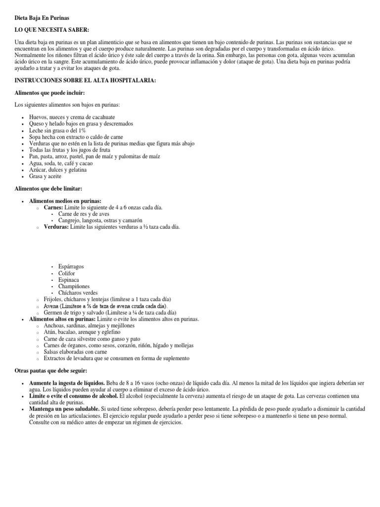 ácido úrico en la sangre. Este acumulamiento de ácido úrico, puede provocar inflamación y dolor (ataque de gota). Una dieta baja en purinas podría