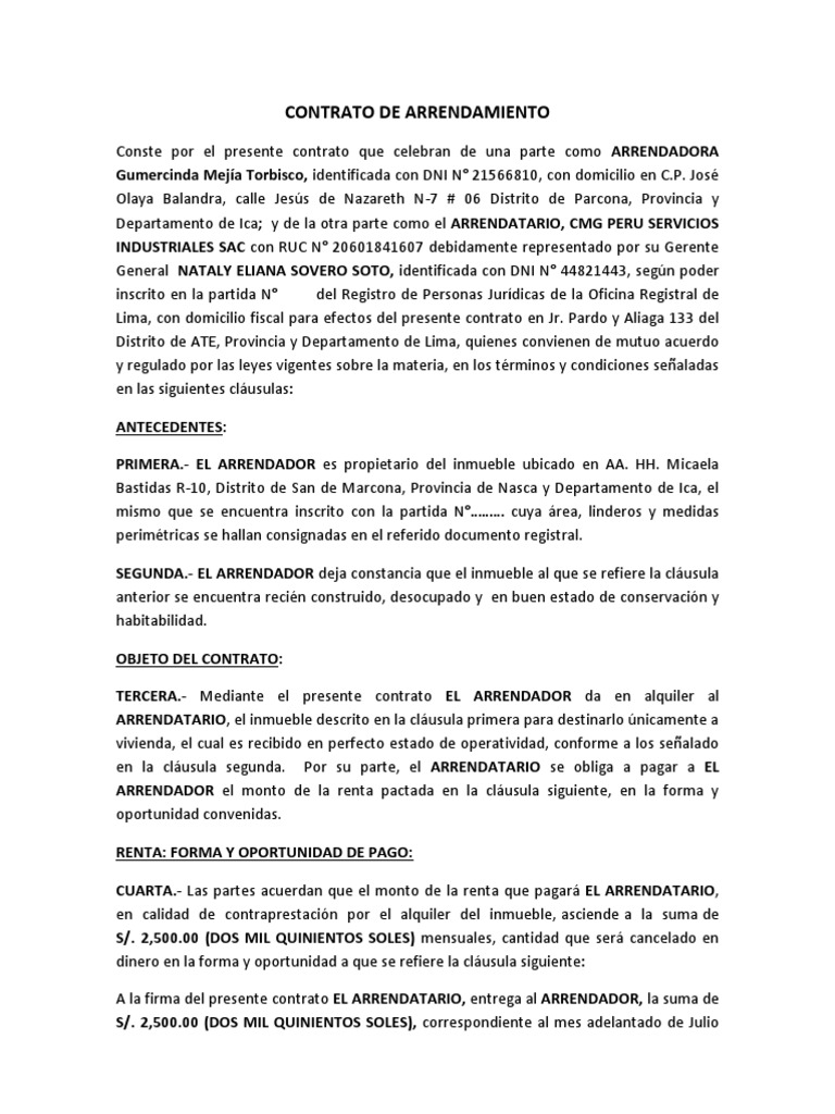 Departamento de Ica; y de la otra parte como el ARRENDATARIO, CMG PERU SERVICIOS