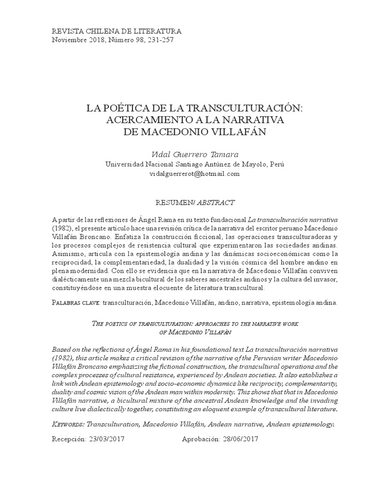 Palabras clave: transculturación, Macedonio Villafán, andino, narrativa, epistemología andina.