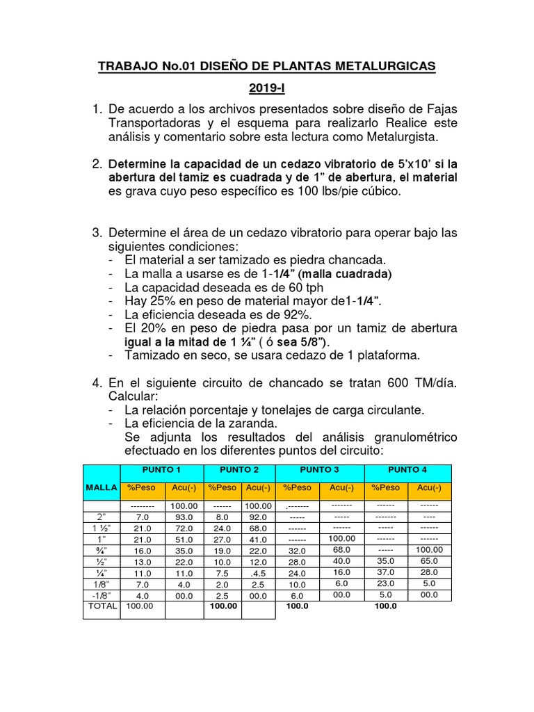 4. En el siguiente circuito de chancado se tratan 600 TM/día.