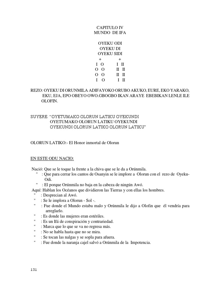Cuando este Odu aparece en adivinación, la persona debe ser advertida hacer sacrificio en su