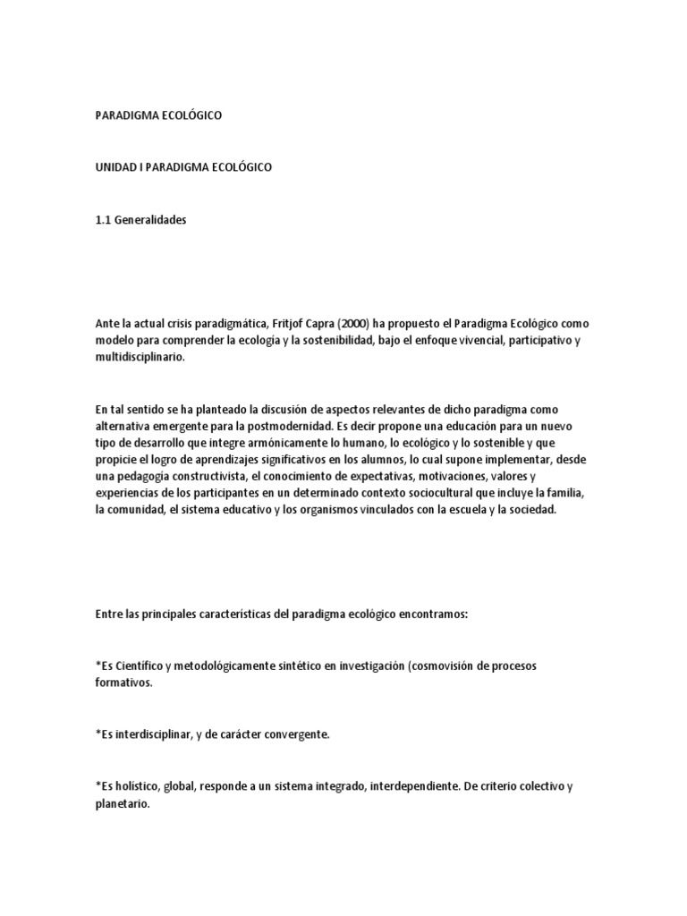 Ante la actual crisis paradigmática, Fritjof Capra (2000) ha propuesto el Paradigma Ecológico como