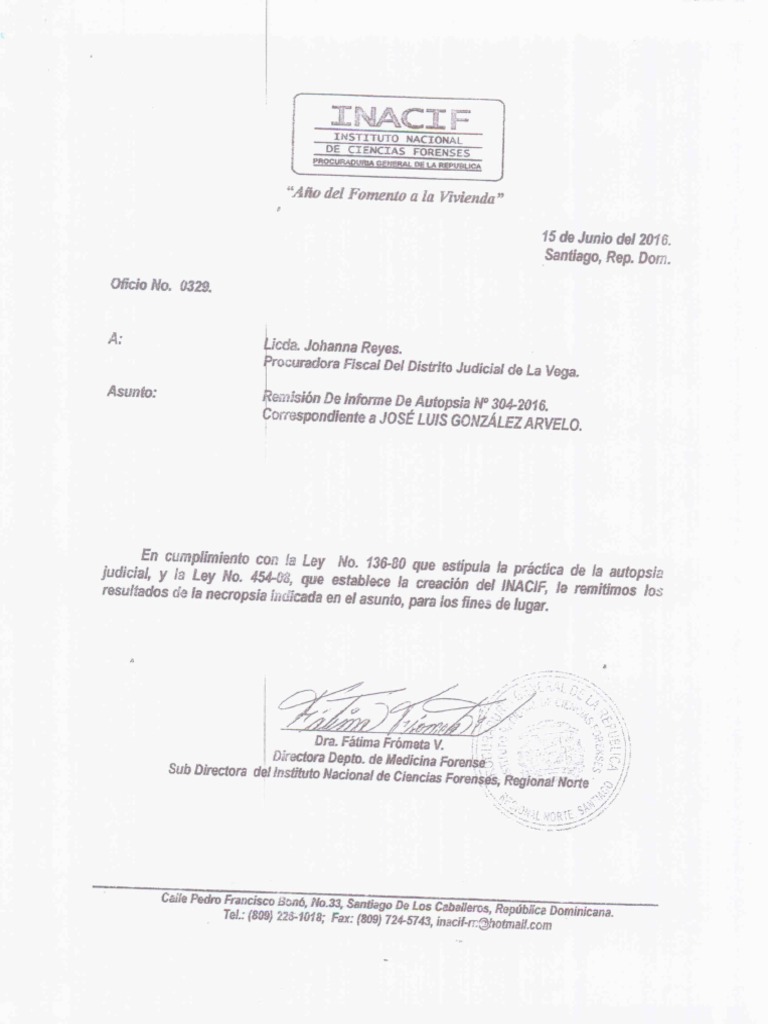 En cumplimiento con fe Ley No. 136-80 que estipula fa préctica de la autopsia